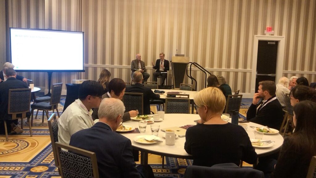 ACGT Scientific Advisory Council member Carl June, MD, (University of Pennsylvania) and ACGT Board of Directors member Marc Engelsgjerd, MD (Royalty Pharma) speak to assembled experts and guests at ACGT’s Lunch Symposium at SITC 2025.